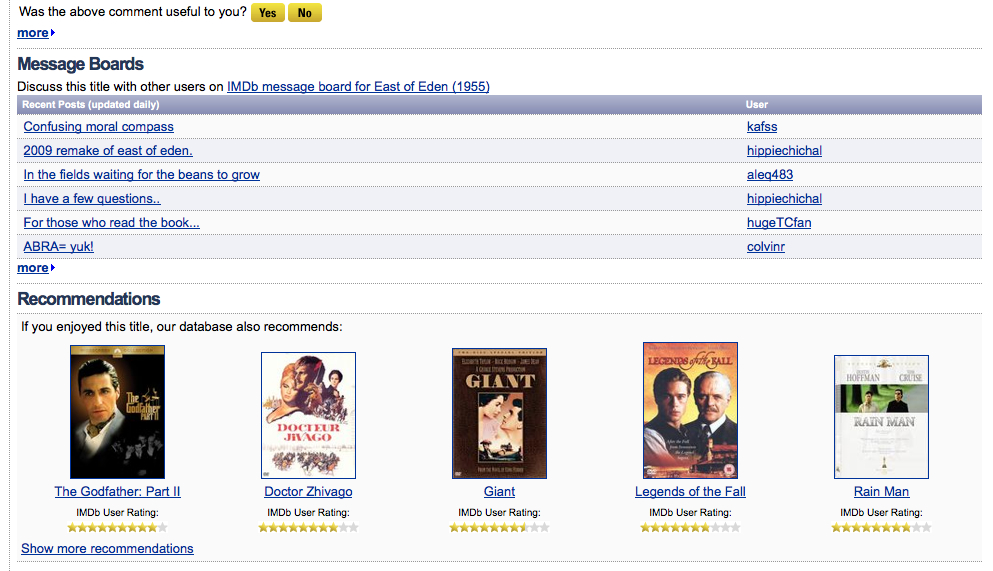 This is why Internet Movie Database’s (IMDb) recommendations and review sections have been so important to their success: the community is seen as relevant, and since the conversation has been archived so that a user will not feel like he has missed anything, every user is a potentially powerful member of the community bound by common interests (who likes what music, buys similar books, etc.) and common desires of self-expression. In essence, by all arriving at the site independently, but then contributing in individual ways, the successful Web 2.0 site IMDb has created Bruffee’s important “community of knowledgeable peers” (p. 644).